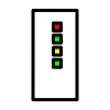 This features a white box with four green lights on it. These lights are arranged in two rows, each containing two lights. The top row of lights is located towards the left side of the box, while the bottom row of lights is situated more towards the center and right side of the box. This unique design gives the impression that the box might be a power supply or an electronic device with multiple functions.