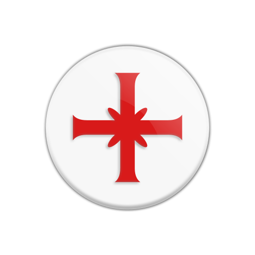 This features a round, white and red cross with the center of the cross being red. This design is reminiscent of a Templar Cross, which has been used as a symbol for various religious and military orders throughout history. The cross appears to be a sticker or button, possibly meant for display on clothing or other surfaces. The combination of white and red colors gives the image a bold and striking appearance, making it an eye-catching decoration or emblem.