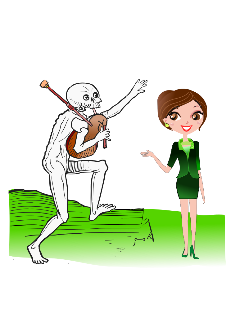 This features a woman standing next to a skeleton who is holding an instrument. The skeleton appears to be playing the instrument, while the woman looks on with interest. They are both positioned in front of a green background that adds a vibrant touch to the scene. The woman's outfit consists of a black dress and she has a green necklace around her neck. The skeleton is wearing a tie, adding an element of formality to the image.