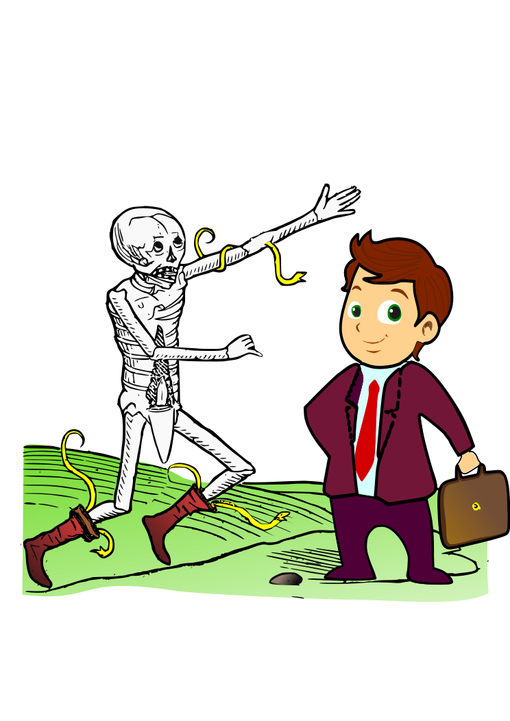 This features a man in a suit and tie standing next to a skeleton. The skeleton is holding a snake, which appears to be wrapped around its neck. The man seems to be observing the skeleton as it stands on one leg with a book in hand. The scene has a cartoon-like appearance, giving it an artistic and whimsical feel.