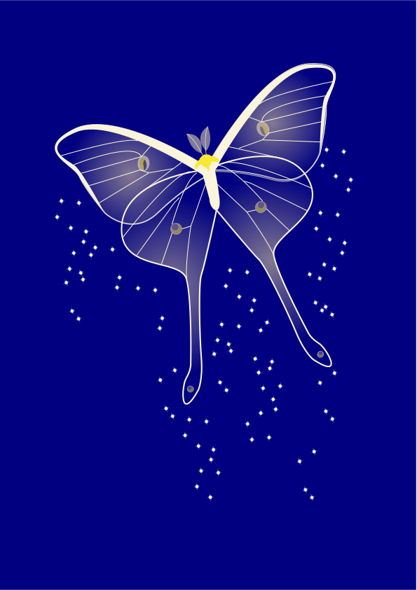 This features a beautiful butterfly with its wings spread out, flying through the air. It is surrounded by a blue background and has a few stars scattered around it. The butterfly appears to be in motion, adding an element of liveliness to the scene. The combination of the butterfly's vibrant colors and the stars creates a visually appealing and serene atmosphere.