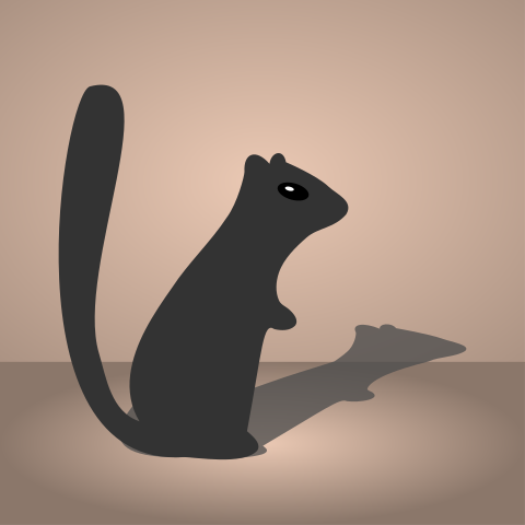 This features a black squirrel standing on the ground, with its shadow visible in front of it. The squirrel appears to be looking at something off-camera, possibly capturing the viewer's attention. Its tail is also noticeable, adding to the realistic appearance of the scene. The overall setting seems to be a simple and natural environment where the squirrel can freely move around.