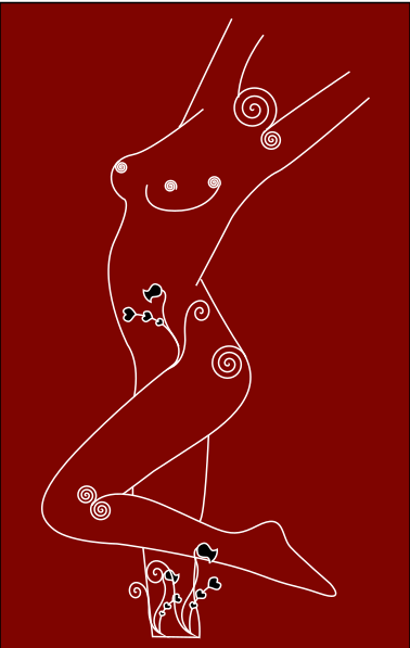 This features a woman with tattoos on her body. She is depicted in red and black colors, giving the impression of being drawn or painted. The woman's figure is surrounded by swirls, adding an artistic touch to the design. There are several dots scattered throughout the scene, which further enhance the visual appeal of the image. Overall, it appears to be a creative and intricate representation of a tattooed female form.