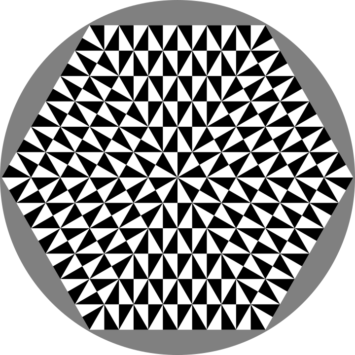 This features a large, round circle with an intricate black and white hexagonal pattern. This design is made up of numerous small triangles arranged in various positions around the circle. The overall effect creates a visually striking and complex pattern that fills the entirety of the circle. The combination of the circular shape and the geometric patterns make this image both interesting and captivating to look at.