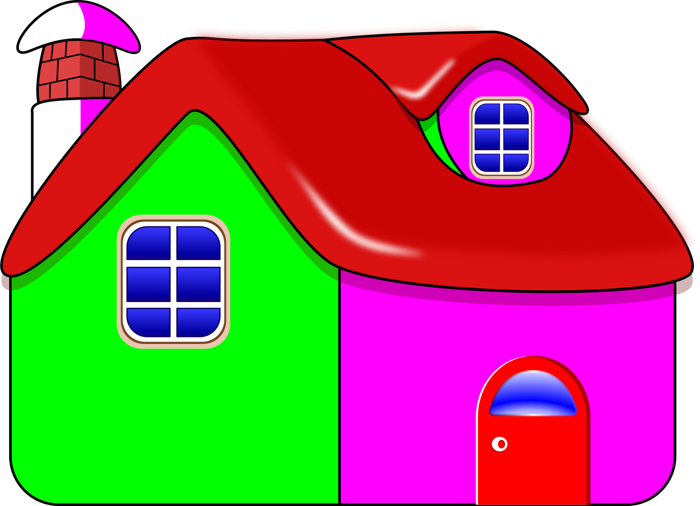 This features a colorful house with a red roof and green walls. It has two windows on the top floor, one on each side of the house. A door is located at the bottom right corner of the house, leading to the interior. The vibrant colors of the house make it stand out against its surroundings.