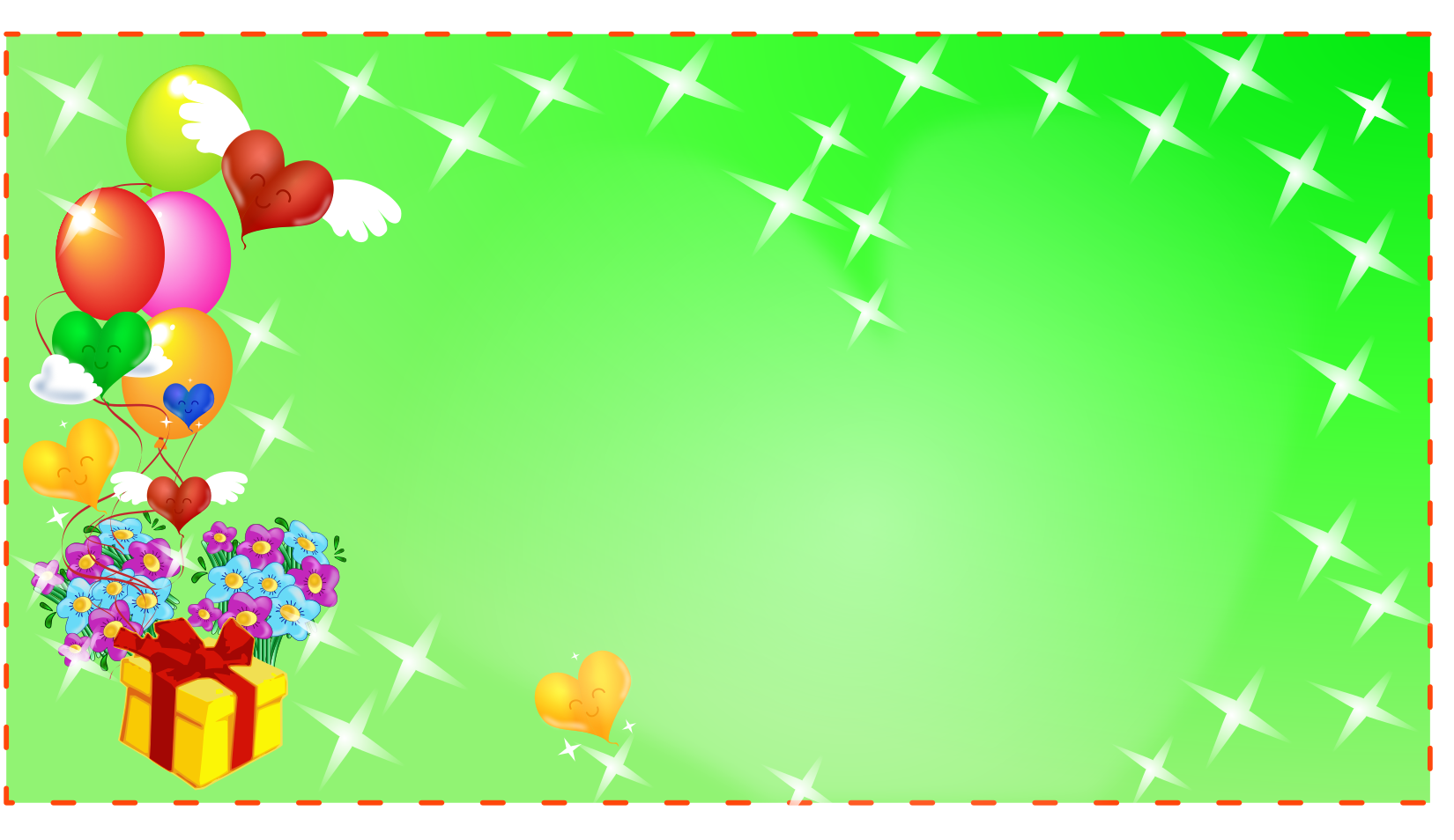 This features a green background with various decorations. There are several balloons scattered across the scene, some of which are positioned near the top left corner and others in the middle right area. Above these balloons, there is an array of hearts with angel wings, adding to the festive atmosphere. Additionally, a gift box can be seen on the left side of the image, accompanied by a red bow that ties it together. The combination of balloons, hearts, and the gift box creates a cheerful and inviting scene.