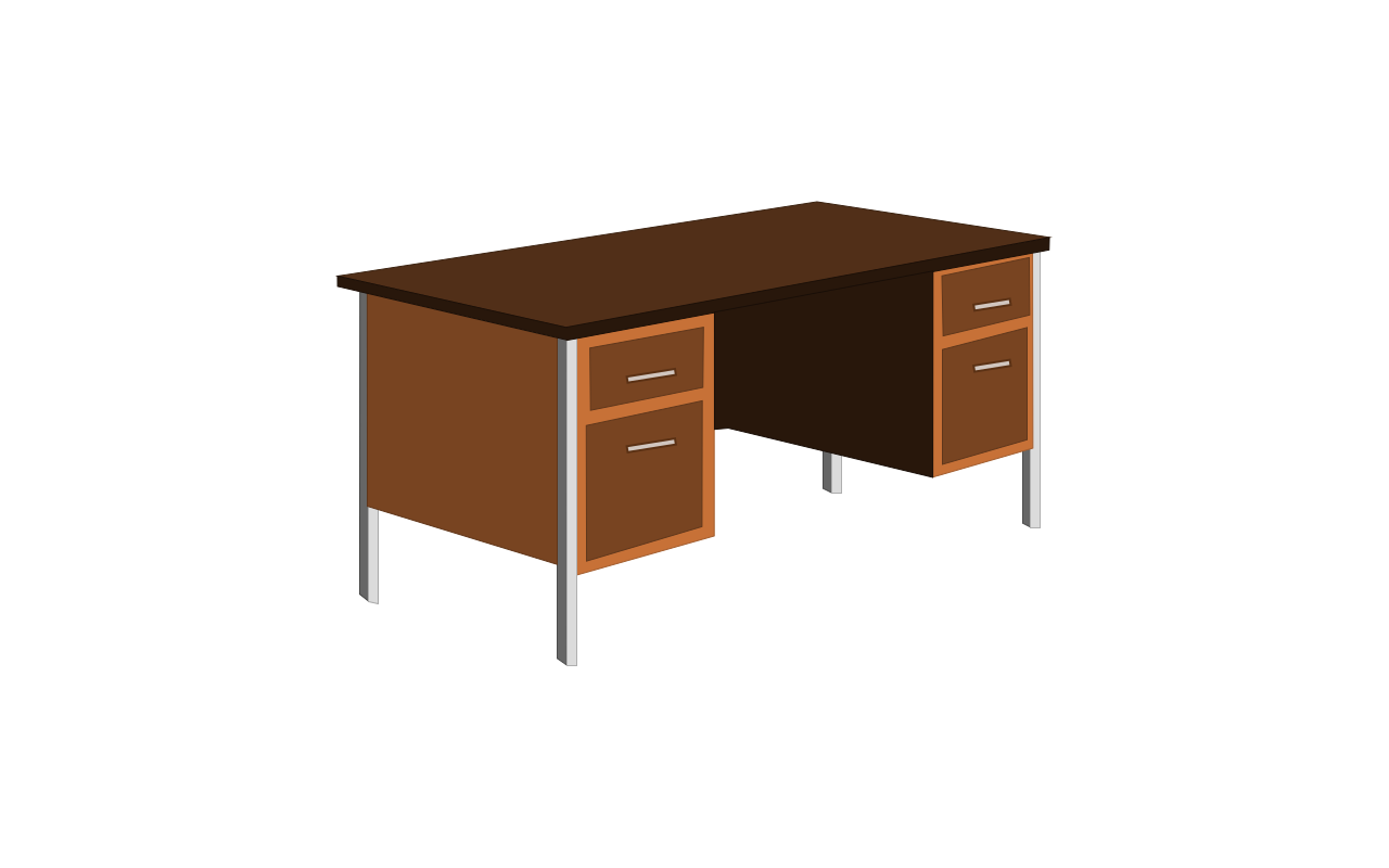 This features a brown wooden desk with two drawers. The desk is placed in the center of the scene, and it appears to be a simple and functional piece of furniture. The desk's design gives off an old-fashioned vibe, which adds character to the space. The desk seems to be the main focus of the image, with no other objects or distractions in the background.