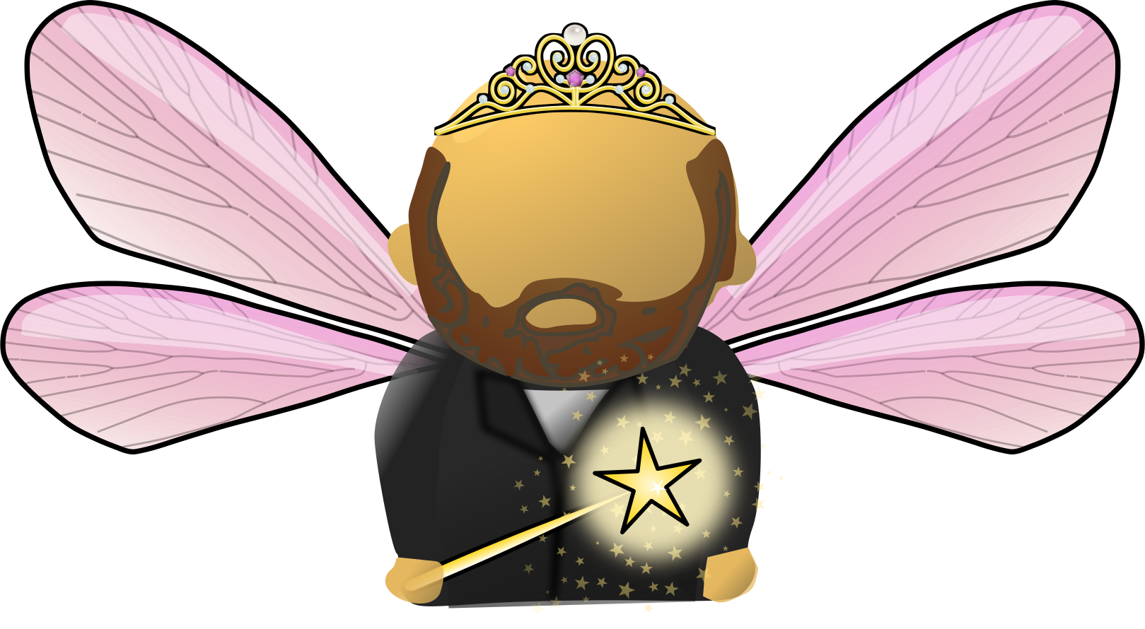 This features a male fairy with pink wings, dressed in black clothing and wearing a tiara on his head. He is holding a magic wand in one hand and a star in the other. This whimsical character appears to be a mix of human and insect-like qualities, making for an interesting and unique design. The fairy's attire and accessories give him a regal and magical appearance, which adds to his overall charm.