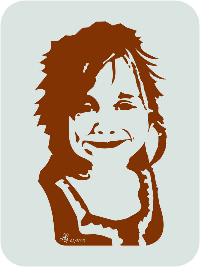 This features a young girl with short hair and a smiling expression. She is wearing earrings, which adds to her unique appearance. The picture has been artistically rendered in brown tones, giving it an old photograph feel. The girl's facial features are prominent, making her the focal point of the image. Overall, this artistic representation captures a joyful moment in time.