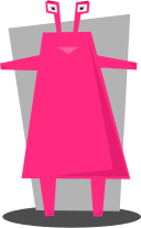 This features a pink cartoon character standing in the foreground, with its legs spread apart. It appears to be an illustration or drawing of a person, possibly resembling a monster or a robot. The character is positioned against a backdrop that consists of a gray wall and a white background. This creates a contrast between the pink cartoon figure and the neutral tones of the background.