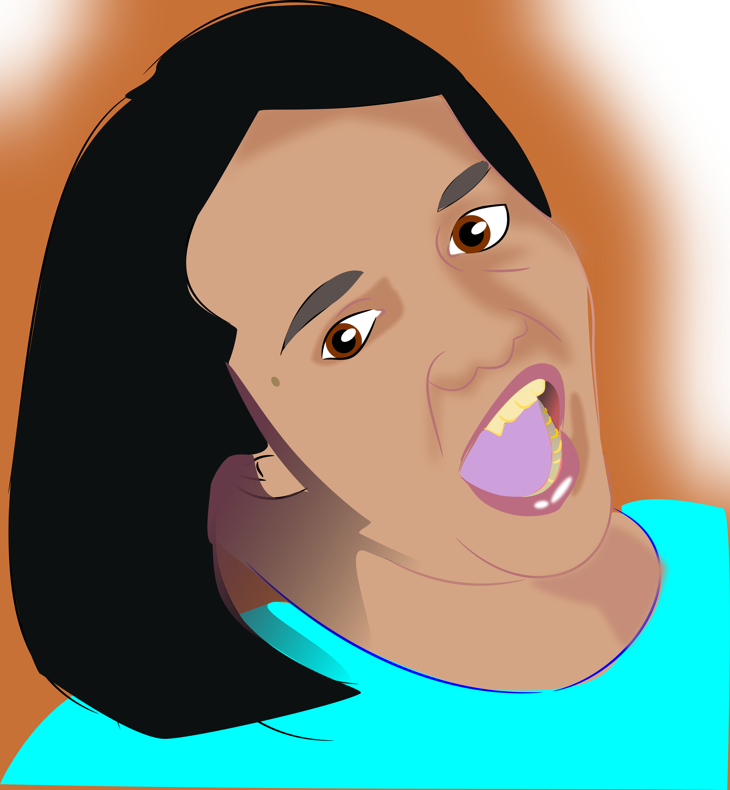 This features a woman with her mouth wide open, possibly making an exaggerated facial expression. She has brown hair and is wearing a blue shirt. Her eyes are closed as she opens her mouth, giving the impression of surprise or excitement. The drawing captures her unique pose and adds a sense of liveliness to the scene.