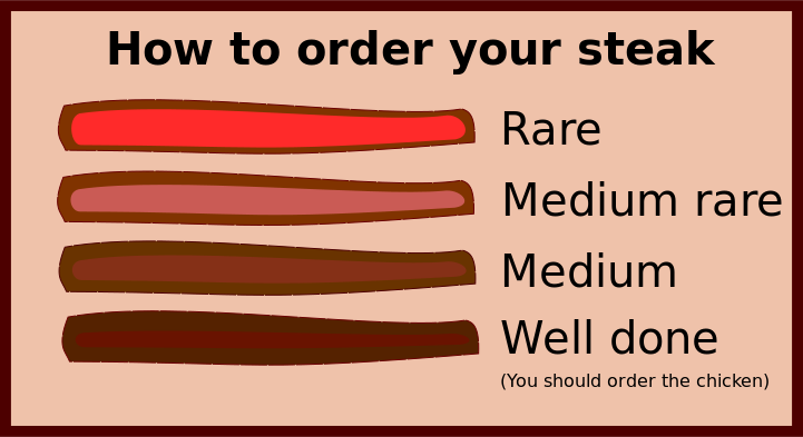 This is a humorous guide on how to order your steak. It features four different types of steaks, each with their own unique description. The first type is described as "rare," the second as "medium rare," and the third as "medium." The fourth type is labeled as "well done" and has an added comment that reads "you should order the chicken." This funny guide is likely meant to be a lighthearted way of teaching people how to order their steak according to their preference.