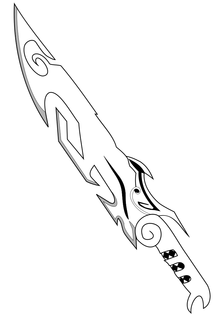 This features a large, ornate sword with intricate designs on its handle. The blade of the sword is long and sharp, making it an impressive weapon. The design on the handle includes swirls and patterns that add to the overall visual appeal of the sword. This artistic representation of a sword showcases the craftsmanship and attention to detail put into creating such a unique piece.