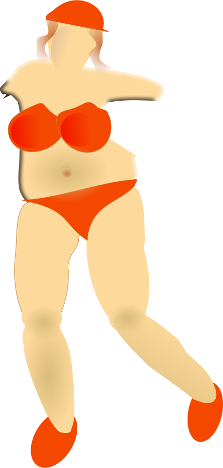 This features a woman in an orange bikini, standing on one foot and posing for the camera. She is wearing a red hat, which adds to her overall appearance. The woman's figure appears to be slightly distorted or abstracted, giving the impression that she might be a cartoon character or a drawing rather than a real person. The image captures her in mid-pose, showcasing her confident and stylish stance.