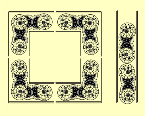 This features a decorative design with an ornate border. This border is made up of various circles and wheels, creating a visually appealing pattern. The circles are arranged in different sizes and positions throughout the frame, adding depth and complexity to the overall design. The intricate details make it suitable for use as a template or a decorative element in artwork or other creative projects.