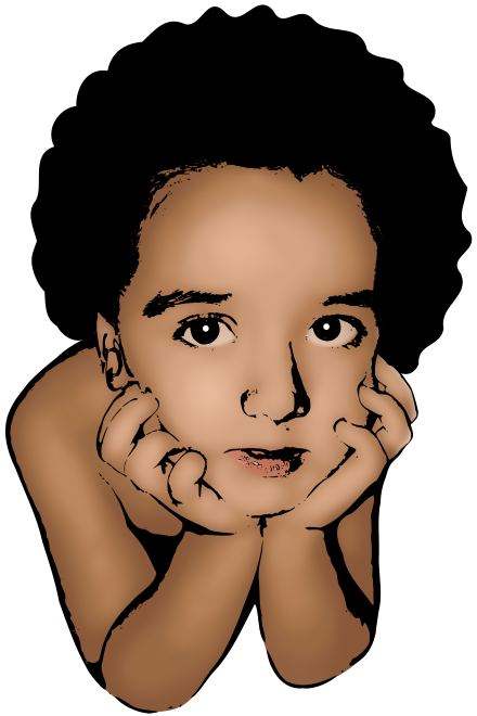 This is a black and white drawing of a young child with an afro hairstyle. The child has his two hands on his face, giving the impression that he might be thinking or contemplating something. The drawing captures the child's facial expression and features, such as his eyes, nose, mouth, and ears. The overall composition of the image is simple yet effective in conveying a sense of innocence and curiosity often associated with young children.