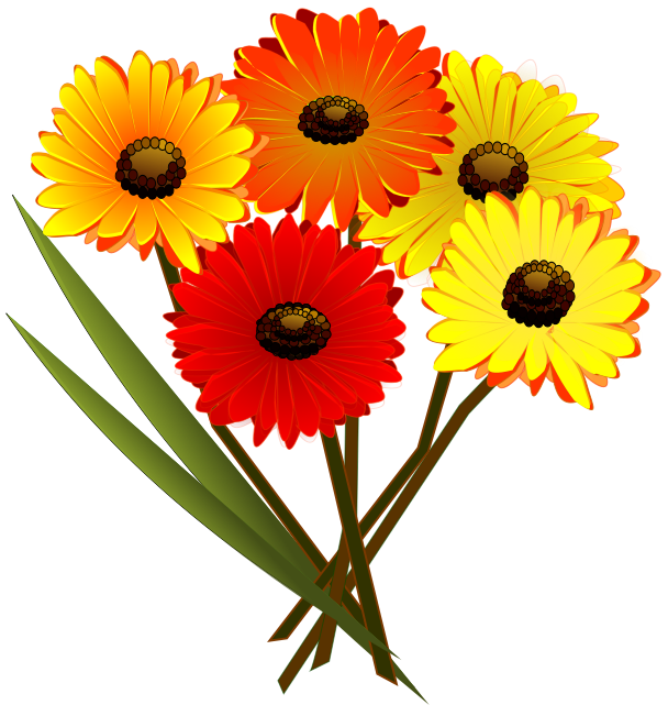 This features a bouquet of five different colored flowers, each with unique hues. These vibrant flowers are arranged in a visually appealing manner and are held together by stems. The colors of the flowers include red, yellow, orange, and brown, creating an eye-catching display. The arrangement is presented against a white background, which allows the flowers to stand out even more prominently.