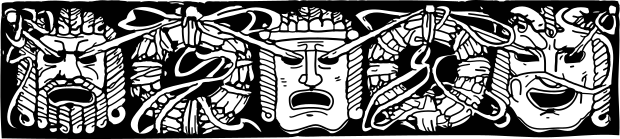 This features a decorative design that includes several greek theater masks. These masks are arranged in an intricate pattern, with some of them appearing to be smiling while others have more serious expressions. The masks are placed on top of each other, creating a visually appealing and artistic display. This unique design could be used as wallpaper or applied to various surfaces for decorative purposes.