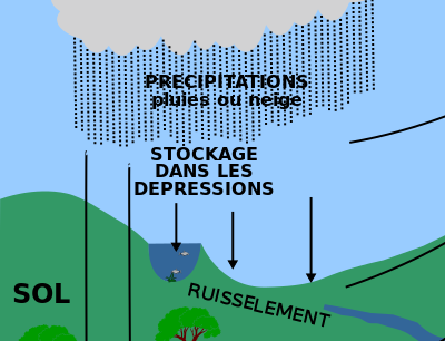 This depicts a cartoon-like representation of the weather, focusing on precipitations and stockage d'eau (water storage). There are several clouds scattered throughout the scene, with one large cloud dominating the upper left portion. A smaller cloud can be seen in the middle of the image, while another is located towards the right side. The cartoon illustrates a rainy day, as evidenced by the numerous rain drops falling from the sky. The main focus of this weather-related cartoon is on precipitations and water storage. There are several arrows pointing to different areas within the image, indicating various aspects related to these topics. The clouds represent the precipitation, while the water storage is illustrated by a large body of water in the middle of the scene. This cartoon effectively conveys the concept of weather conditions and their impact on our environment.