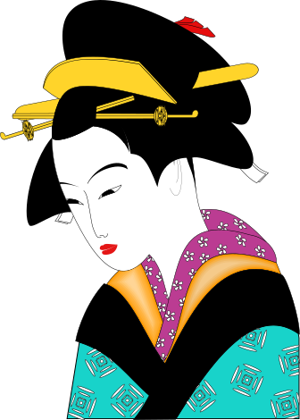 This is a colorful drawing of an oriental woman with long hair, wearing a black and purple kimono. She has a pink scarf around her neck and is adorned with gold jewelry. Her face features a red lipstick smile, adding to the vibrant appearance of the portrait. The drawing captures the beauty and elegance of this woman in traditional oriental attire.