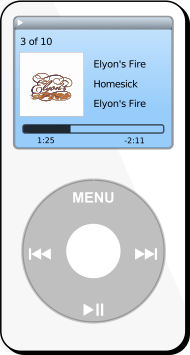 This features a small white iPod with the screen displaying music information. On the screen, there is an album cover for Elyon's Fire and the song Home Sweet Home. The iPod is in the middle of playing this song. The device has a menu button on the bottom left corner and a play/pause button at the top right corner. The image gives off a sense of nostalgia, as it represents an older technology compared to modern smartphones.