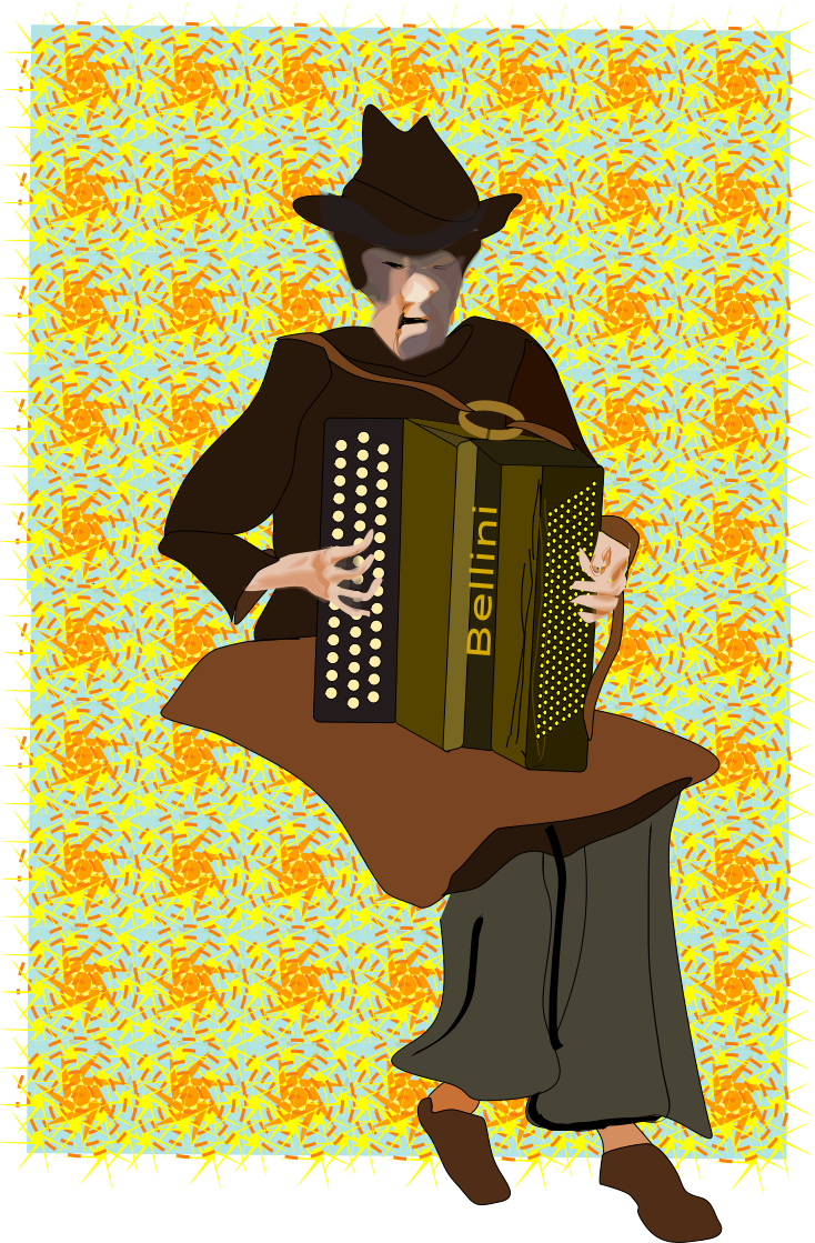 This features a man dressed in old-fashioned clothing, wearing a hat and holding an accordion. He is sitting down while playing the instrument, which appears to be yellow in color. The man's outfit suggests that he might be performing at a festival or event where people gather to enjoy music. The scene takes place against a backdrop of a patterned wall, adding visual interest to the image.