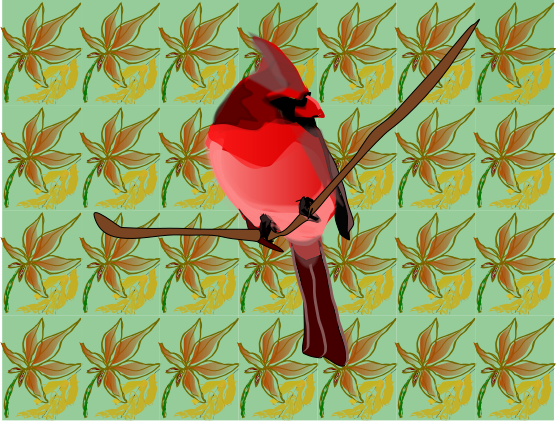 This features a red bird perched on a branch, surrounded by green leaves. The bird is the main focus of the scene and appears to be sitting in front of a patterned background that includes yellow flowers. The bird's positioning suggests it might be looking at something off-camera or simply enjoying its surroundings. The combination of the red bird and the green leaves creates an eye-catching contrast against the colorful background, making this image visually appealing.