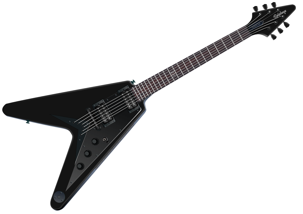 This features a black electric guitar with a white background. It is an up-close shot of the guitar, showcasing its design and details. The guitar has six strings, which are visible in the picture. The neck of the guitar is also prominently displayed, giving viewers a clear understanding of its structure. Overall, this image provides a detailed look at the electric guitar's appearance and features.