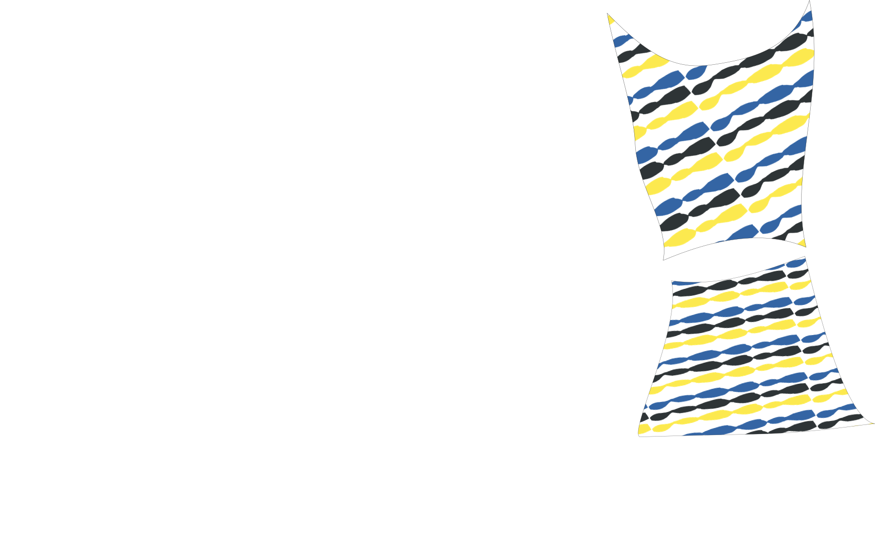 This features a yellow and blue striped dress, which is the main focus of the scene. The dress has a unique design with its colorful stripes, making it stand out against the background. In addition to the dress, there are two other smaller figures in the picture, one located on the left side and another towards the right side. These figures appear to be part of the same image but do not draw as much attention as the main subject, which is the striped dress.