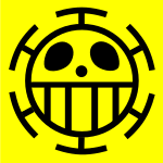 This features a yellow circle with a black outline, which is an emblem of the character "Skull" from the popular manga and anime series One Piece. The skull has two large eyes, one on top and another below, giving it a distinctive appearance. The design resembles a face with a wide-open mouth, adding to its unique charm. This emblem is often used as a symbol of the Skull Pirates, a group of pirates in One Piece who are known for their fearlessness and determination.