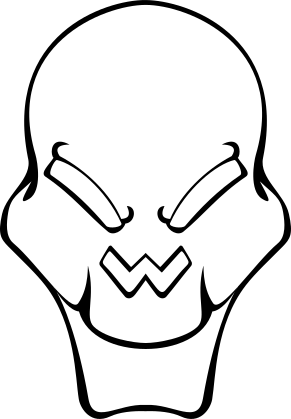 This features a skull with two eyes and a mouth, giving it an evil appearance. It is a black and white drawing that appears to be a cartoon or comic-style character. The skull's facial expression gives the impression of being angry or aggressive. This design could be used for various purposes such as in video games, movies, or other forms of entertainment where a scary or menacing character is needed.