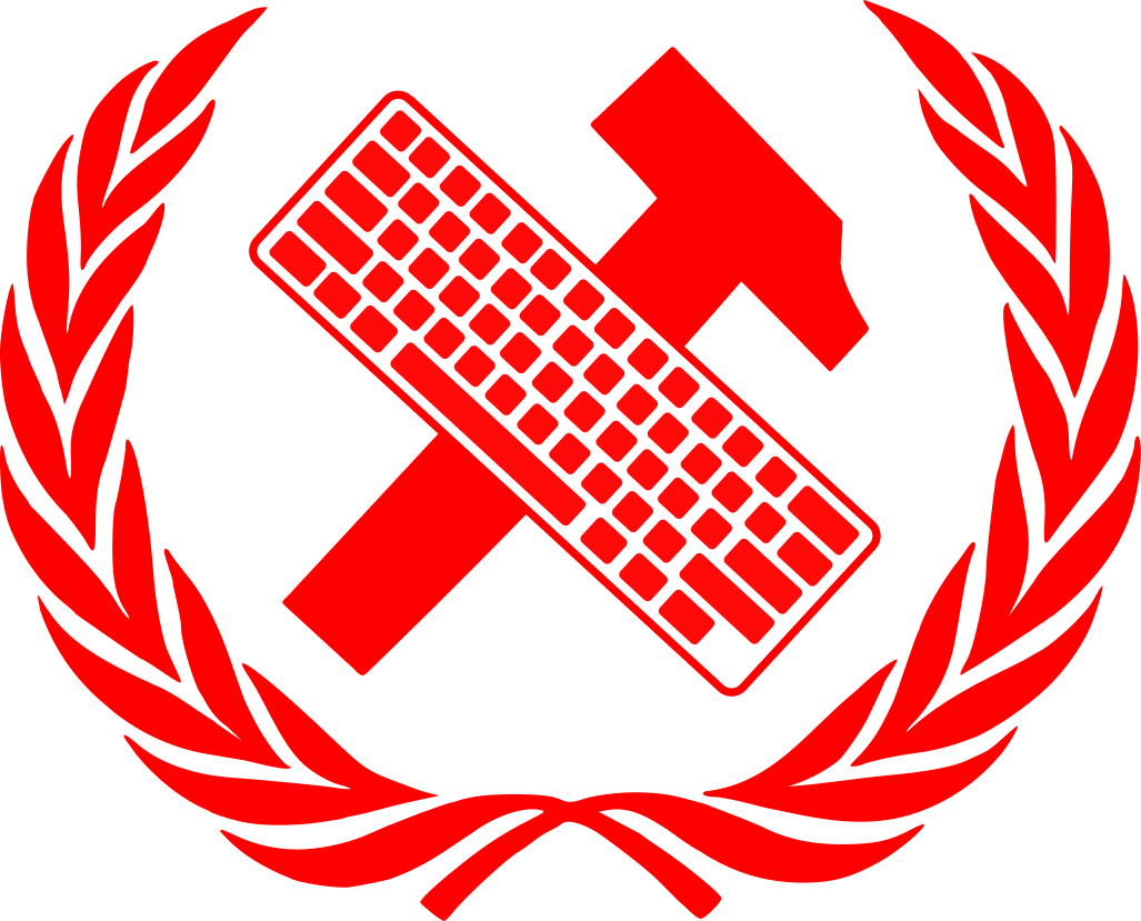 This features a red laurel wreath with a hammer and keyboard symbol in the center. The hammer is prominently displayed, while the keyboard takes up a significant portion of the space around it. This symbolic representation could be associated with the worker unite movement or a similar cause that emphasizes unity and solidarity among workers. The red color of the wreath and the bold design of the hammer and keyboard make this image visually striking and memorable.