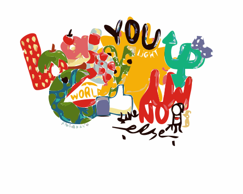 This is a colorful collage of various objects, including fruits and vegetables. There are multiple apples scattered throughout the collage, with some placed in the top left corner, others in the middle right section, and a few more towards the bottom right side. A banana can be seen on the far left side, while an orange is located near the center of the image. In addition to fruits, there are several other objects featured in the collage. A handbag is placed in the top middle area, with a clock positioned towards the bottom right corner. A cup and a spoon can be found on the left side of the image, while a bottle is located near the center-right section. There's also a person depicted in the lower right corner, possibly enjoying some fruit or engaging in an activity related to the objects in the collage.