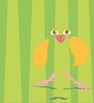 This features a cartoon bird with an odd appearance, standing in the middle of a green and yellow striped background. It has a large head and long legs, giving it a unique look. The bird's feet are positioned on the ground, and its body is surrounded by the vibrant stripes of the background. This whimsical image captures the viewer's attention with its unconventional design and playful colors.