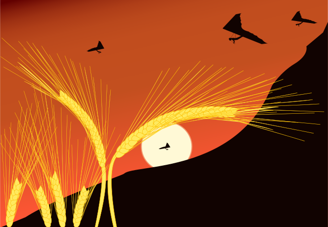 This features a beautiful sunset with a silhouette of a bird flying in the sky. The bird is positioned towards the left side of the scene, while the sun appears to be setting behind it. In addition to the main bird, there are several other birds scattered throughout the sky, adding to the serene atmosphere of the image. The birds vary in size and distance from each other, creating a sense of depth and movement within the scene. Overall, this artistic representation captures the beauty of nature during sunset hours.