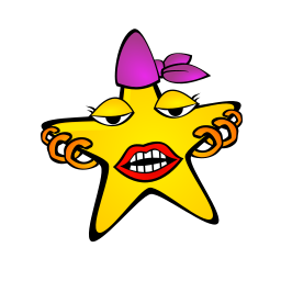 This features a yellow star with a purple bow on top, giving it an adorable and playful appearance. The star has a big mouth, complete with teeth and a tongue sticking out, making it look like it is talking or expressing its emotions. This whimsical design could be used for various purposes such as decoration, clothing, or even as a character in a children's storybook.