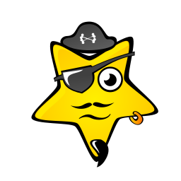 This features a yellow star with a pirate's hat on, giving it a fun and playful appearance. The star is wearing a mustache and has a pair of glasses, adding to its unique character. It appears to be the main focus of the image, occupying most of the frame. The overall design gives off a sense of adventure and whimsy, making it an interesting and eye-catching piece of artwork.