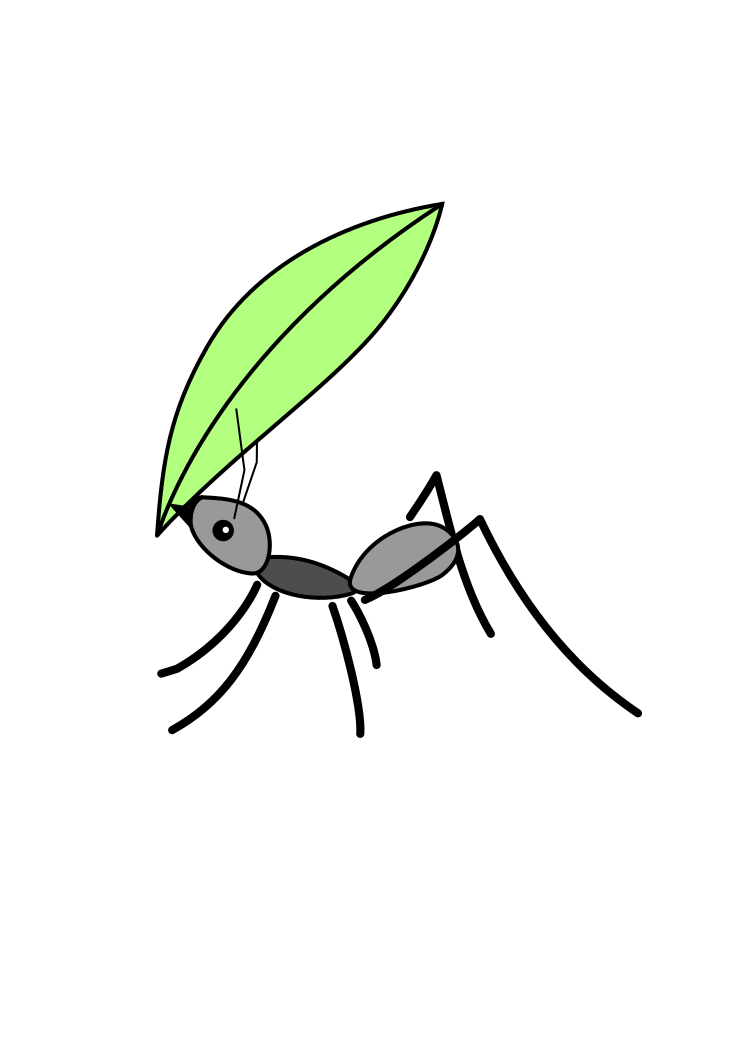 This features a cartoon-like drawing of an ant holding a leaf. The ant is positioned in the center of the scene, with its legs spread out and its body occupying most of the frame. The leaf it holds appears to be green and somewhat large compared to the ant itself. This whimsical illustration captures the essence of nature's smallest creatures while adding a touch of humor through the anthropomorphism of the ant.