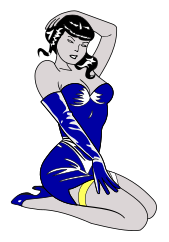 This features a woman wearing a blue dress and black stockings. She is sitting on her legs, with one leg crossed over the other. Her hair is styled in an updo, giving her a sophisticated appearance. The woman's outfit suggests that she might be attending a formal event or simply enjoying a relaxing moment at home.