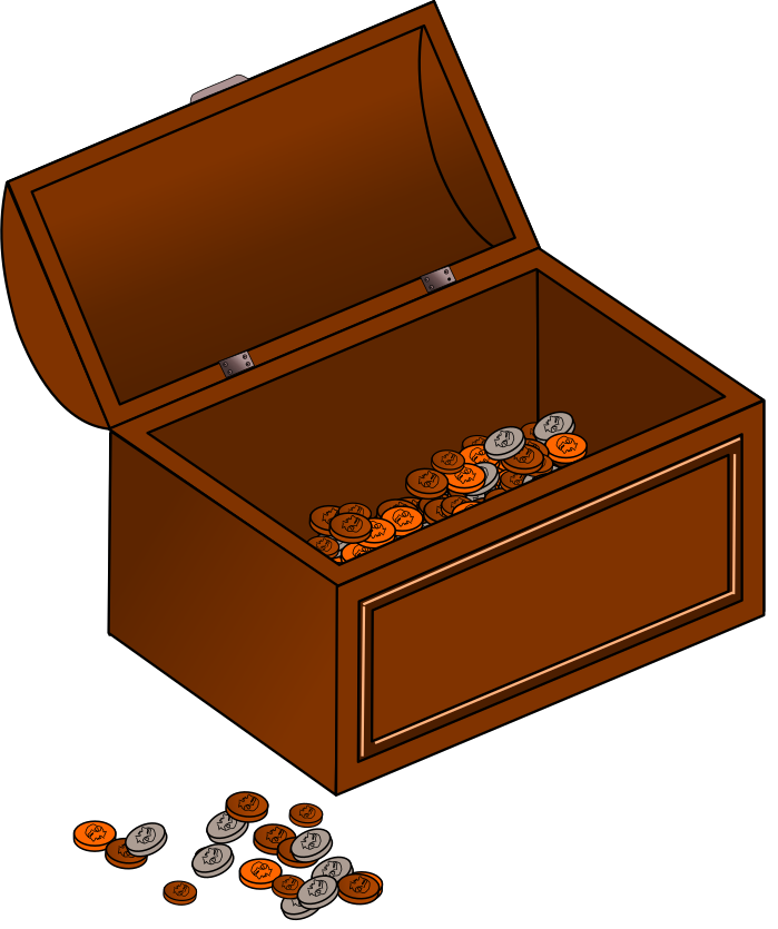 This features a brown wooden chest with coins inside. The chest is filled with various types of coins, including pennies and dimes, creating an assortment of colors and sizes. The coins are scattered throughout the chest, filling it to the brim. The overall scene gives off a sense of adventure and excitement as one might imagine finding treasure in such a container.