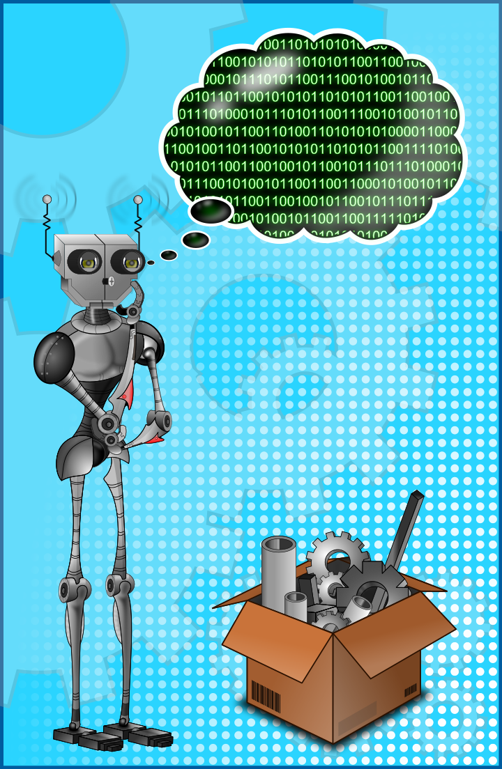 This features a robot standing in front of a cardboard box filled with metal parts. The robot appears to be thinking, as it has a thought bubble next to its head. The background is light blue and there are large gears on the wall behind the robot. The scene gives off an impression of a futuristic setting or a workshop where the robot might be assembling or repairing something using the metal parts in the box.