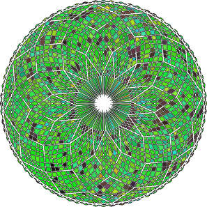 This features a large, colorful green circle with an intricate design. In the center of the circle, there is a flower-like pattern that stands out against the vibrant background. The circle appears to be made up of many smaller circles or shapes, creating a visually appealing and complex pattern. This artistic piece could be used as a decorative element in various settings, such as homes, offices, or public spaces, adding a touch of color and creativity to the environment.