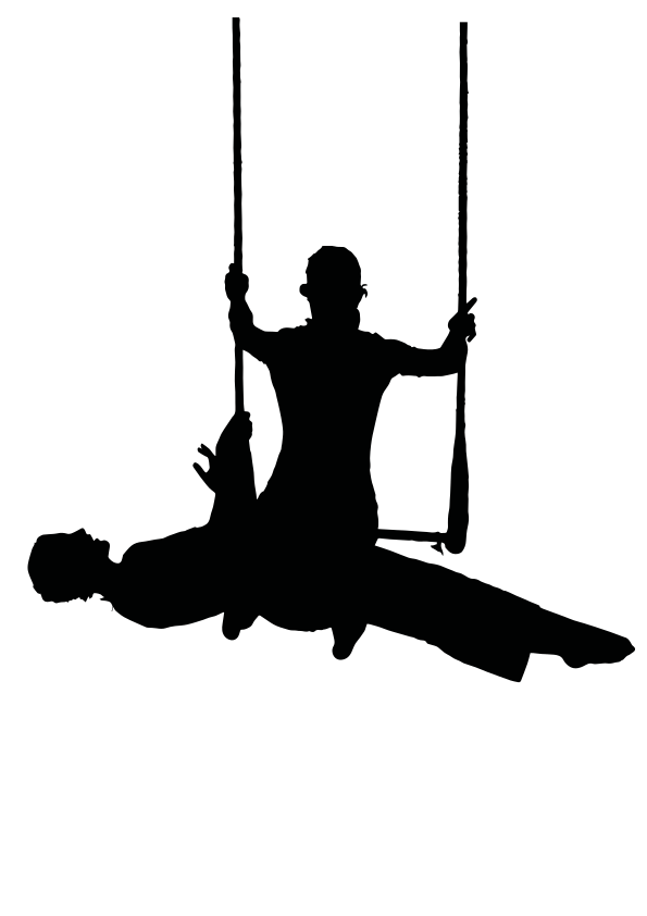 This features a silhouette of two people, one on the left and another on the right side, performing an acrobatic act. They are suspended in mid-air by their feet while holding onto swings or poles. The scene appears to be a black and white photo, emphasizing the contrast between light and shadow. The silhouettes of the two people are positioned at different heights, with one being higher than the other. This adds an interesting visual element to the image, as it creates depth and perspective in the composition. The overall effect is a striking representation of human strength and agility, showcasing the incredible feats that can be achieved through practice and dedication.
