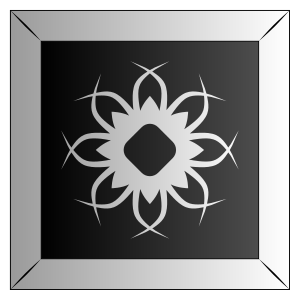 This features a black and white design with a silver outline. It appears to be an abstract floral pattern, possibly resembling a sunflower or a star. The design is placed within a silver frame, which adds a touch of elegance to the overall presentation. The combination of the black background and the silver outline creates a striking contrast that draws attention to the intricate details of the design.