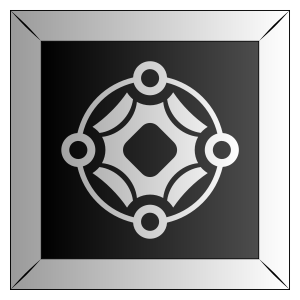 This features a black and white design with a silver outline. It is an abstract square tile that has a unique pattern, possibly resembling a circle or a diamond shape. The tile appears to be the central focus of the image, taking up most of the frame. The contrast between the black background and the silver outline creates a visually striking composition.