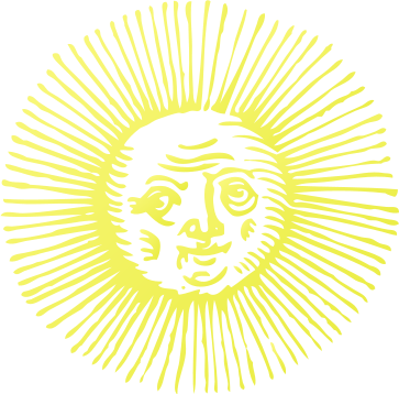 This features a yellow sun with a face drawn on it, giving the appearance of a smiling face. The sun is surrounded by a circle that resembles a halo or a golden frame. This unique illustration adds an artistic touch to the sun's representation. The overall color scheme of the image is predominantly yellow, which gives it a warm and inviting feel.