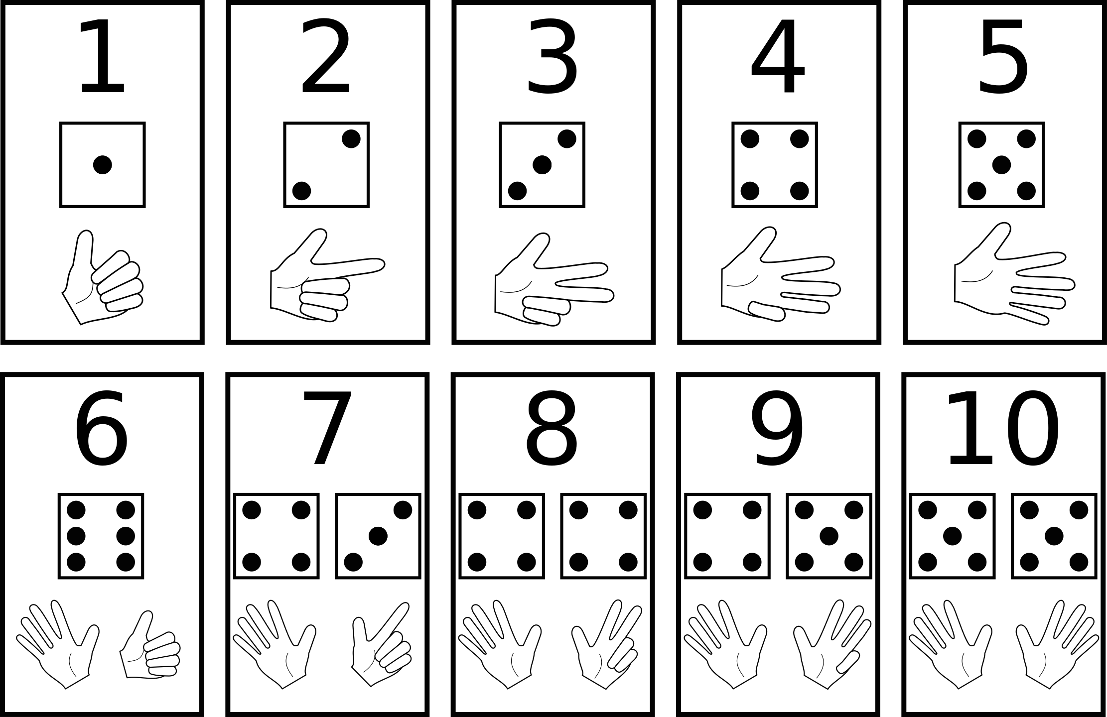 This is a collection of ten different pictures, each featuring a number and a hand pointing to it. These images are arranged in a row, with the numbers progressing from one to ten. In addition to the numbers and hands, there are also several dice present within the images, adding an element of playfulness to the arrangement. The combination of numbers, hands, and dice creates a visually engaging and educational display that can be used for various purposes such as teaching counting or learning about probability.