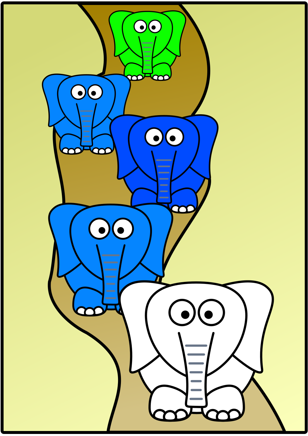 This features a group of five elephants, each with different colors. They are arranged in a line and appear to be walking up a hill or climbing a tree. Each elephant has a unique color: one is blue, another green, and the remaining three are white. The elephants have big eyes, giving them an expressive look as they make their way upwards. This scene could represent a playful representation of children's imagination or a creative artwork that showcases the beauty of these majestic animals.