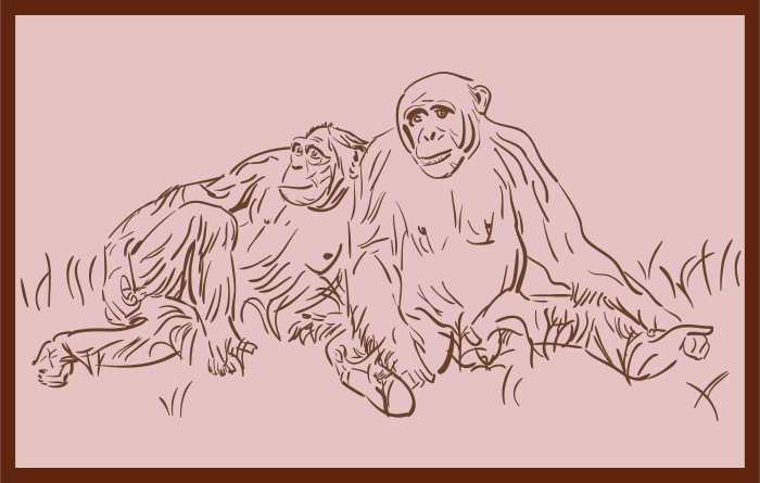This features a drawing of two monkeys, one sitting and the other lying down on the ground. They are positioned next to each other in a grassy field. The monkey that is sitting appears to be looking at the other monkey as they both rest together. The scene captures a moment of relaxation for these two creatures, showcasing their connection and companionship.