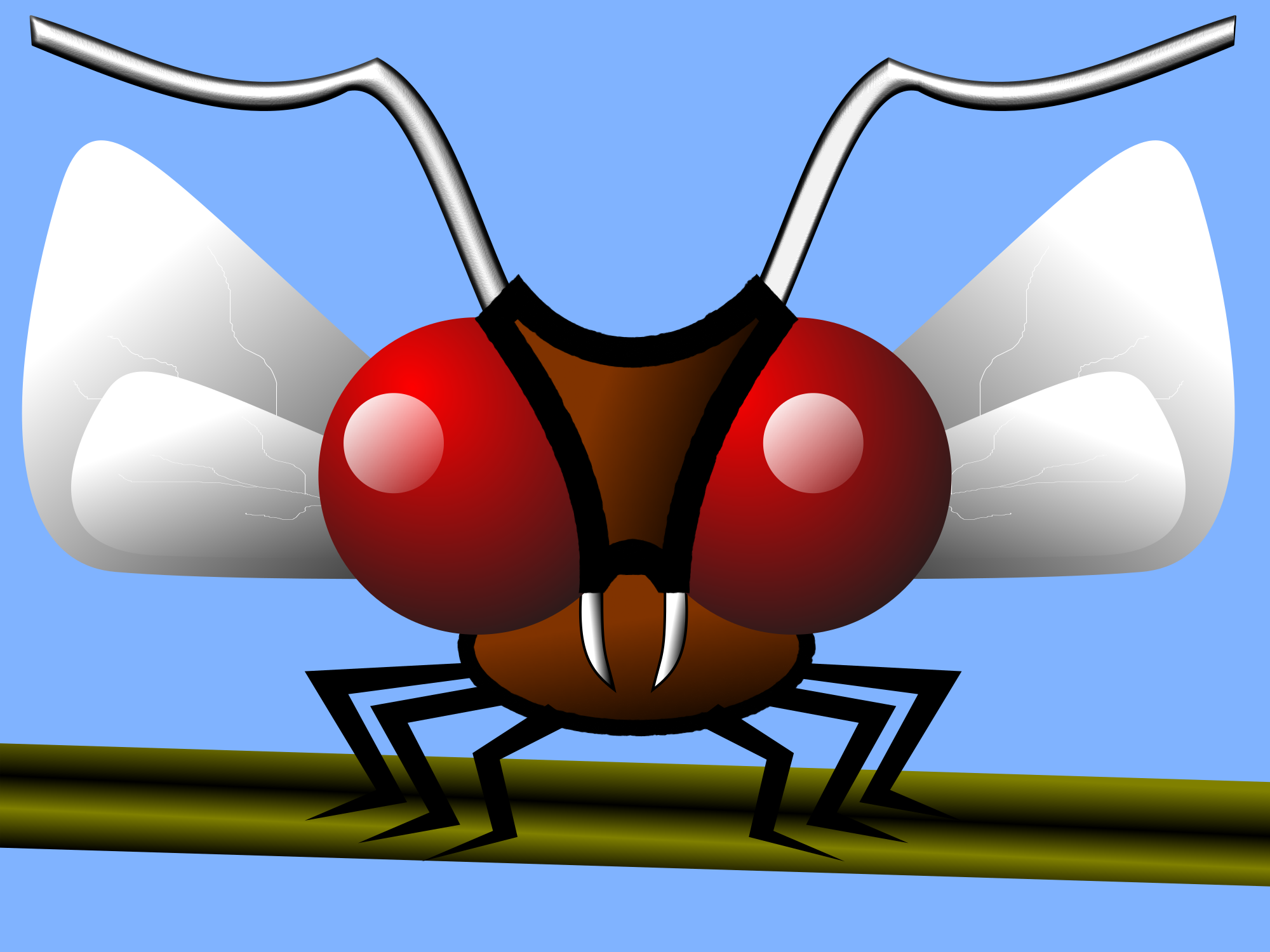 This features a cartoon-like drawing of a brown fly with four wings. It has red eyes, which adds to its unique appearance. The fly is positioned on the ground, standing on one leg and looking upwards. This whimsical illustration captures the essence of a fly in an artistic manner, making it an interesting visual piece.